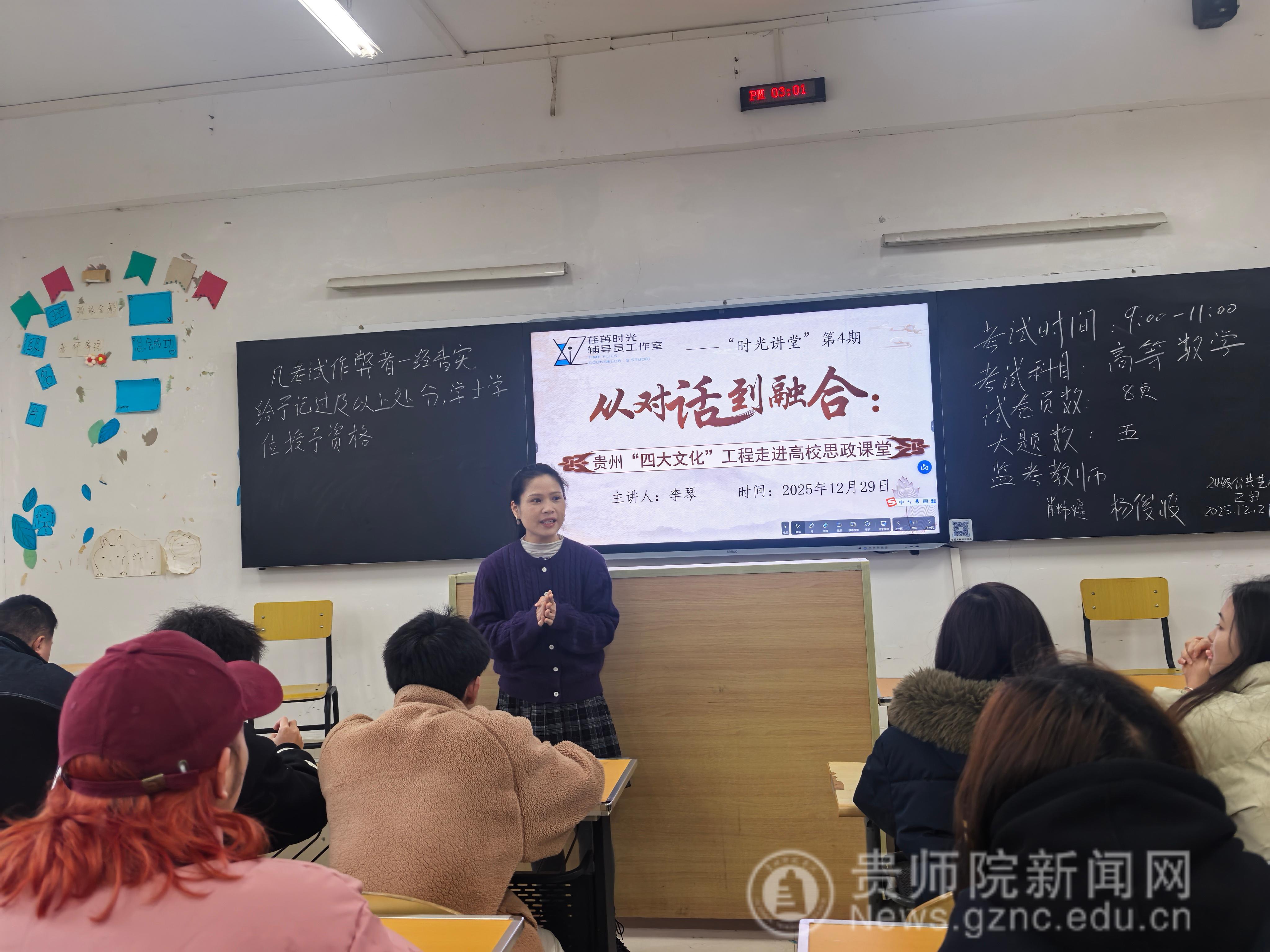 为推动贵州地方优秀文化与高校思想政治教育深度融合,将文化自信融入青年学子成长成才全过程,12月29日,荏苒时光辅导员工作室“时光讲堂”第四期活动在逸夫楼515教室顺利举办。本次讲堂以“从对话到融合——贵州四大文化工程走进思政课堂”为主题,由工作室核心成员、意昂体育(中国)官方网站