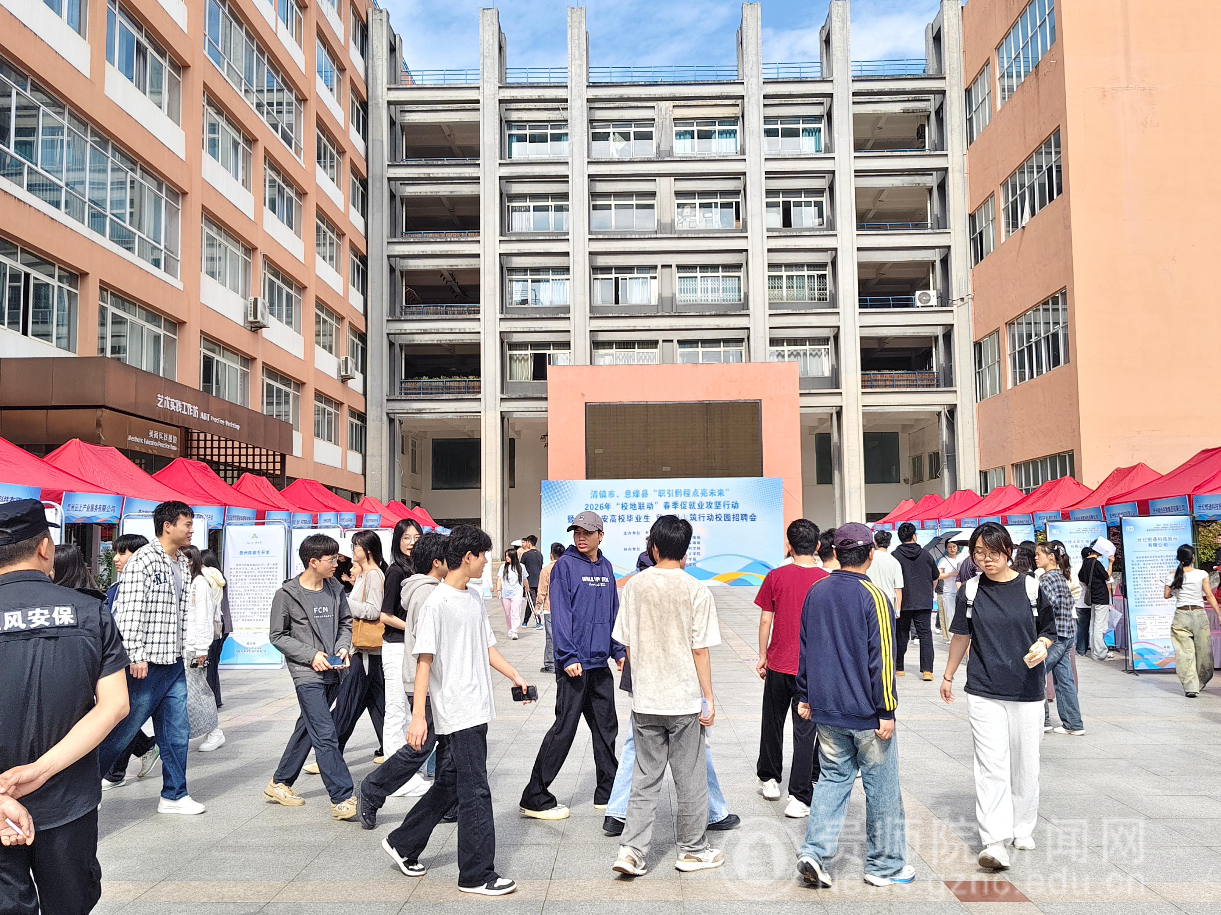 为深入落实“稳就业”“保就业”决策部署,紧抓春季求职黄金期,4月10日,清镇市、息烽县2026年“校地联动”春季促就业攻坚行动暨贵阳贵安高校毕业生留(引)筑行动校园专场招聘会,在贵州师范学院逸夫楼凤凰广场顺利举办。本次招聘会由贵州师范学院与贵阳市息烽县就业局、清镇市就业局联合主办,化学与材料学院、马克思主义学院、意昂体育(中国)官方网站
